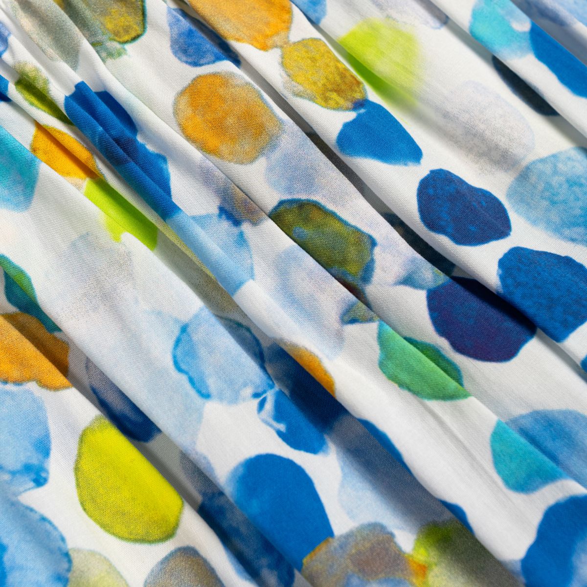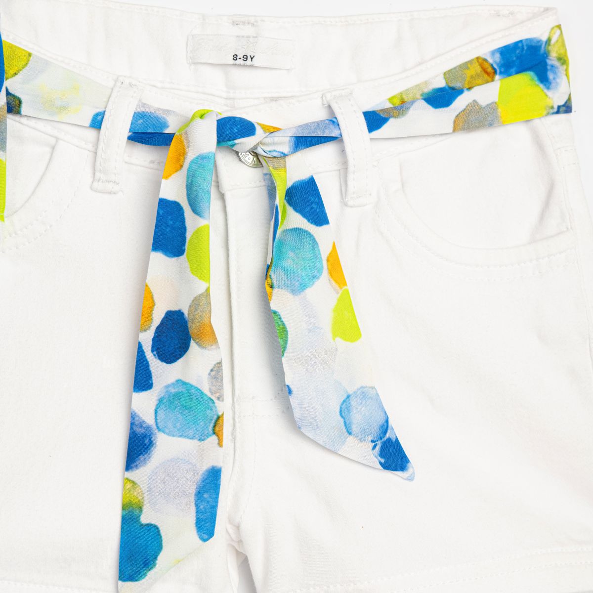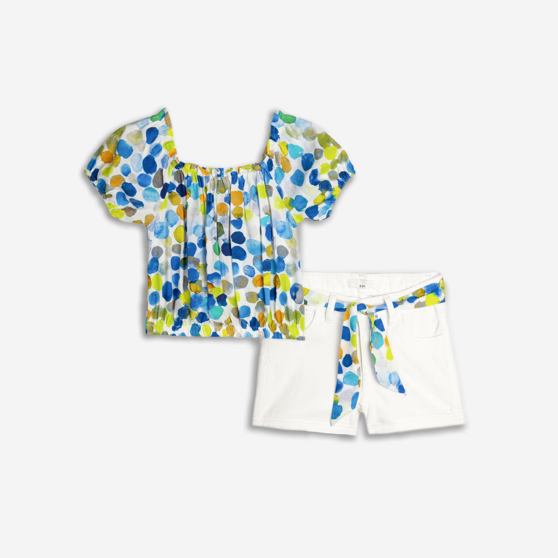 CONJUNTO DE SHORTS CORTO BLANCO CON LAZO EN CINTURA Y TOPO DE COLORES AZULES Y VERDE LIMA, IDEAL PARA VERANO.