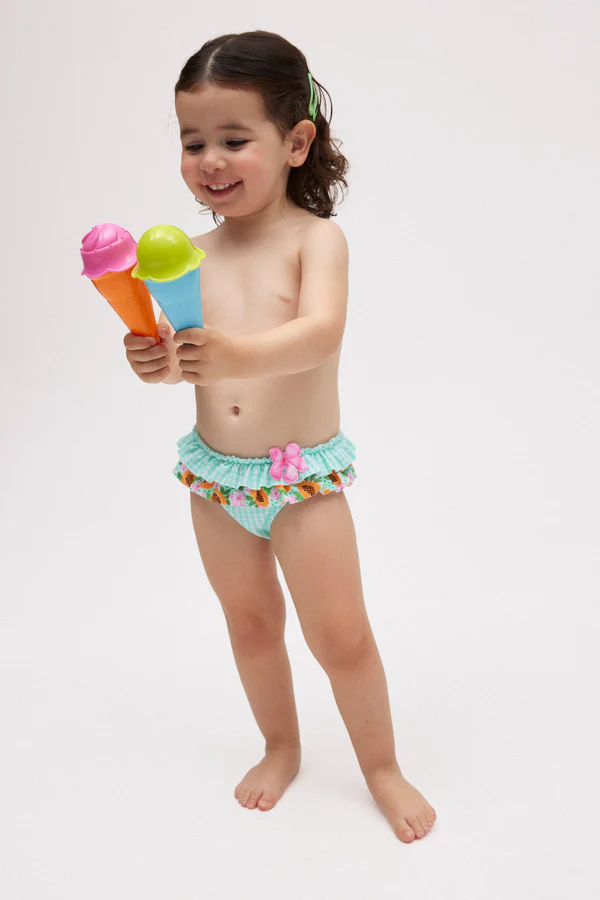 Culetín de tipo braguita para niña con volantes y estampado de cuadro vichy. Detalle de doble volante y flor en 3D en el borde superior.